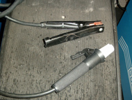 - Bei kurzen Unterbrechungen darf der Elektrodenhalter oder Lichtbogenbrenner nur auf einer isolierten Unterlage abgelegt werden. Dies verhindert, dass ein unerwünschten Stromkreises entsteht,der Leitungen und Geräte schädigen kann.