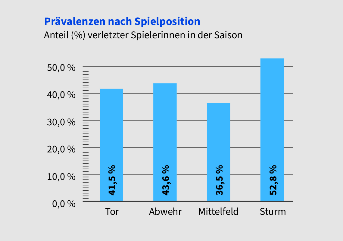 Rund 42 Prozent der Spielerinnen haben sich während der Saison verletzt – dabei war der Anteil der Spielerinnen, die mindestens eine Verletzung erlitten haben, in der Bundesliga deutlich höher (53 %) als in der zweiten Bundesliga (38 %). Stürmerinnen waren am häufigsten (53 %) betroffen, Mittelfeldspielerinnen am seltensten (37 %). Die Häufigkeit der Verletzungen nahm mit steigendem Alter und der Dauer des Einsatzes auf dem Spielfeld zu.